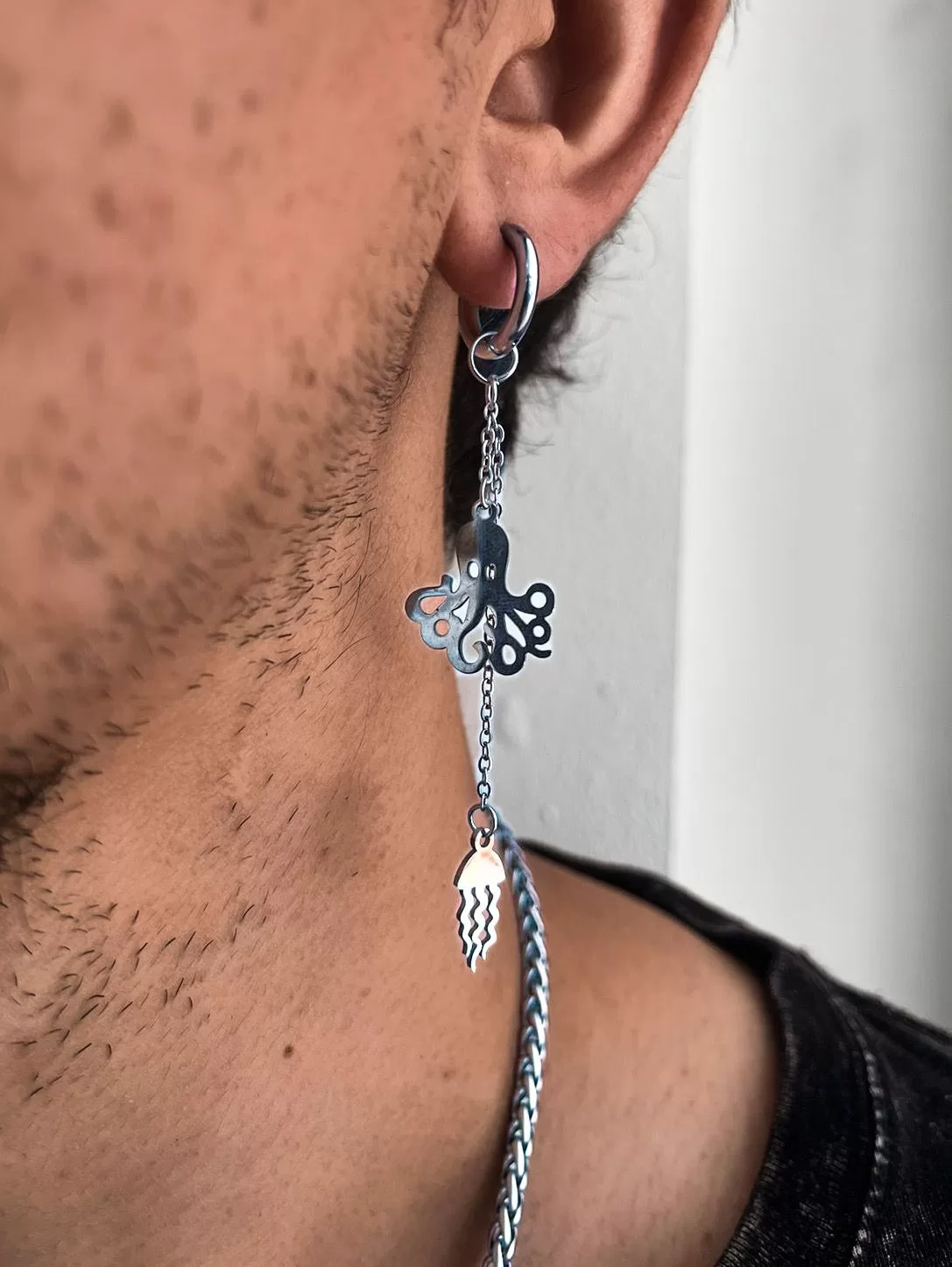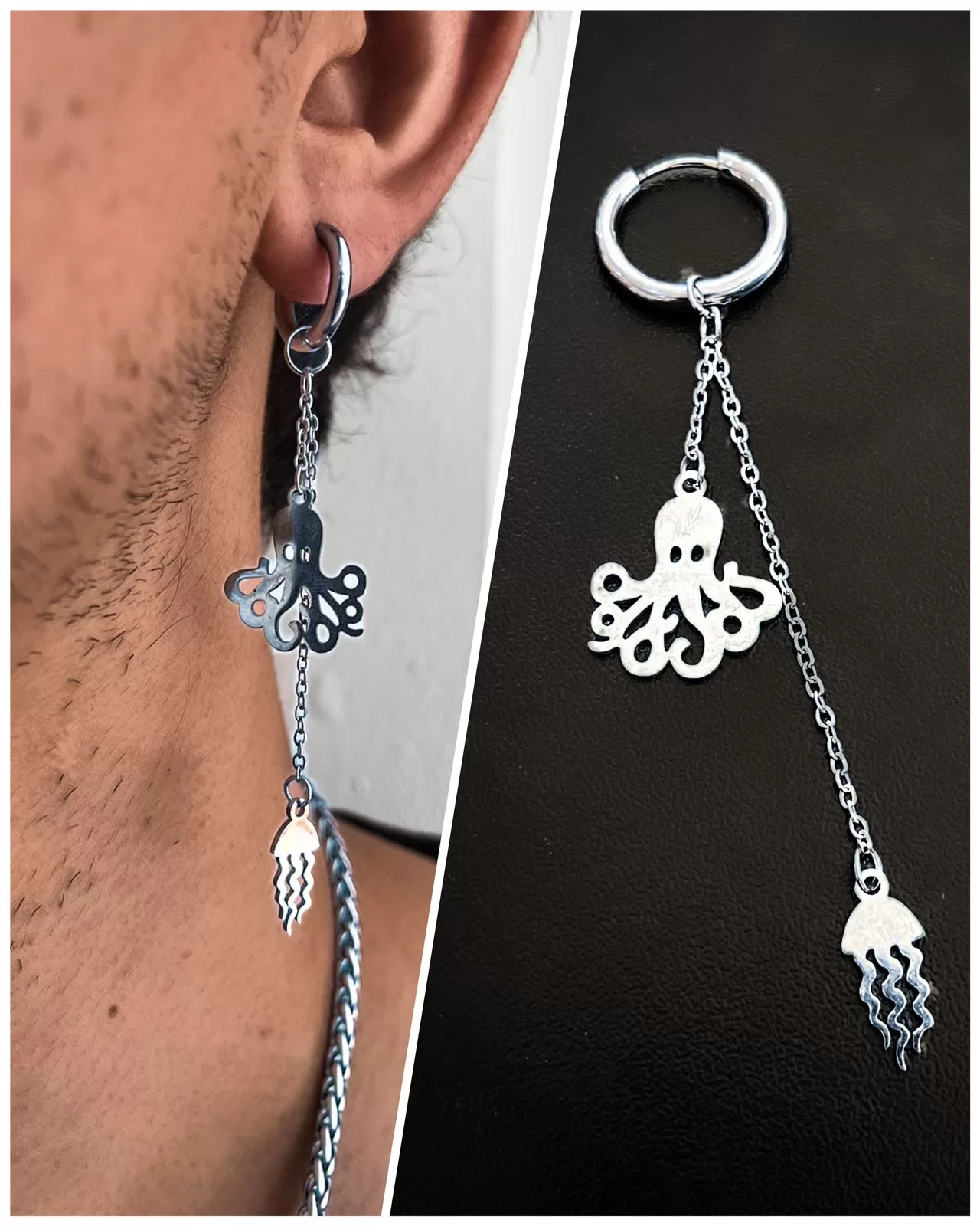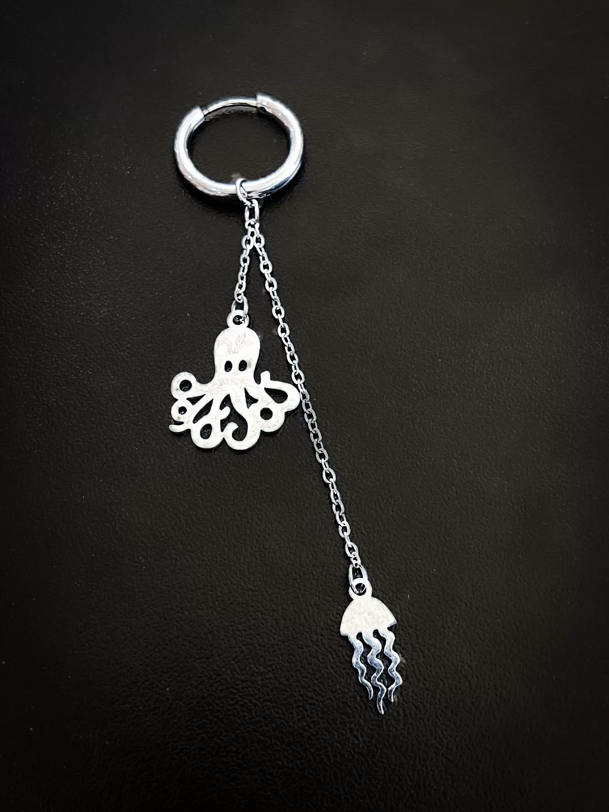 Este aro no es simplemente una joya; es una expresión encantadora del misterio y la belleza del mar. Fabricado en acero quirúrgico de alta calidad, este aro presenta una cadena con una figura de pulpo en un extremo y una medusa en el otro, creando un diseño único y cautivador.