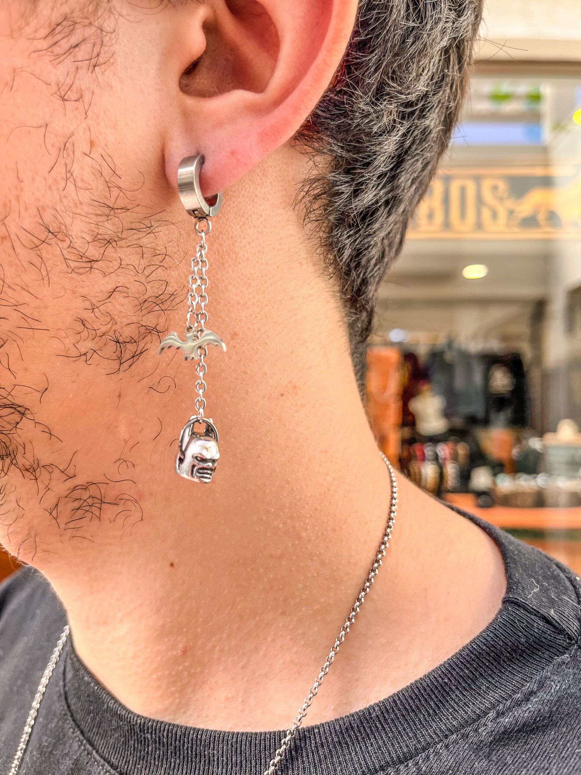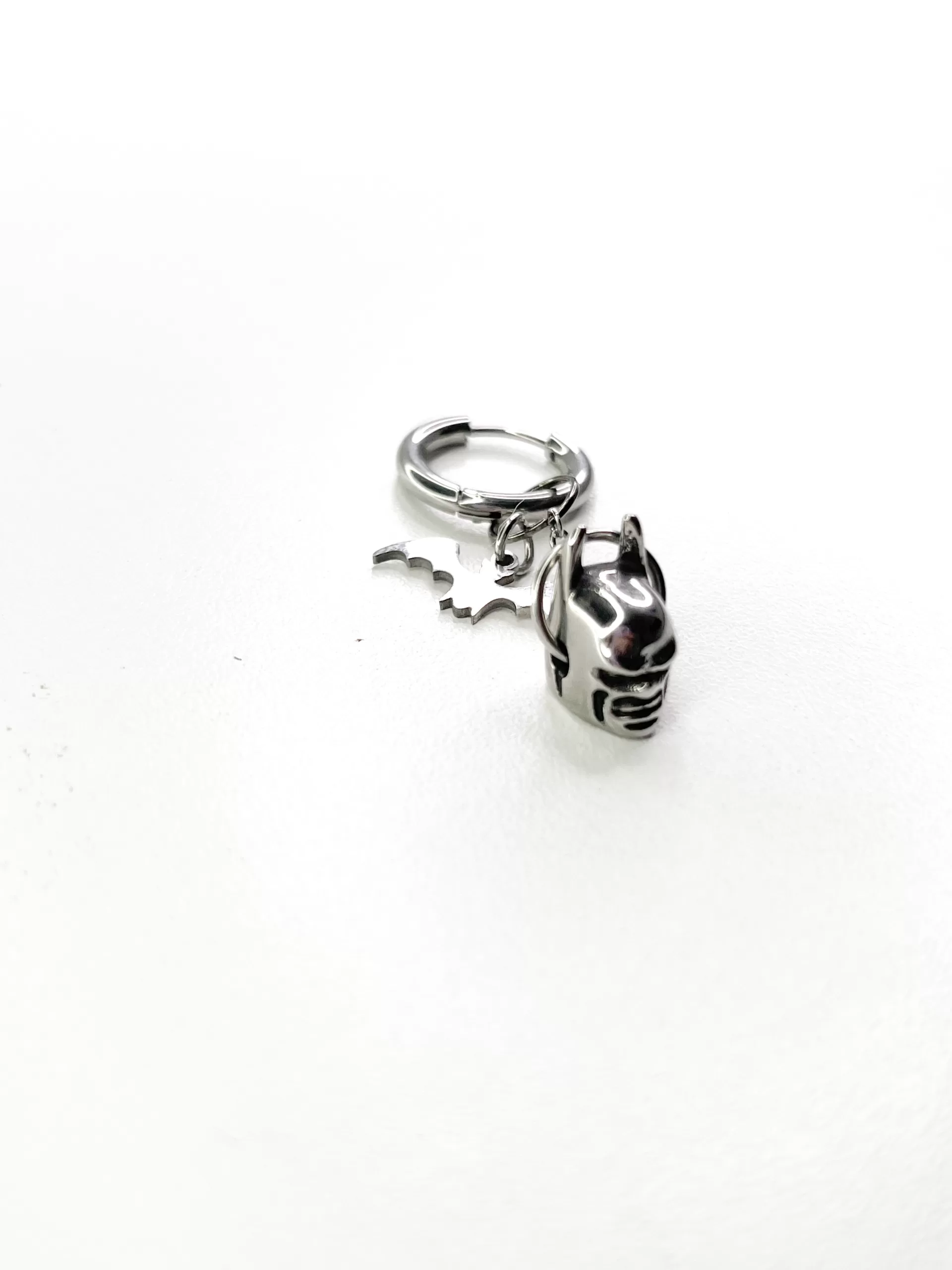 - Diseño: Aro colgante con detalle de murciélago inspirado en Batman.