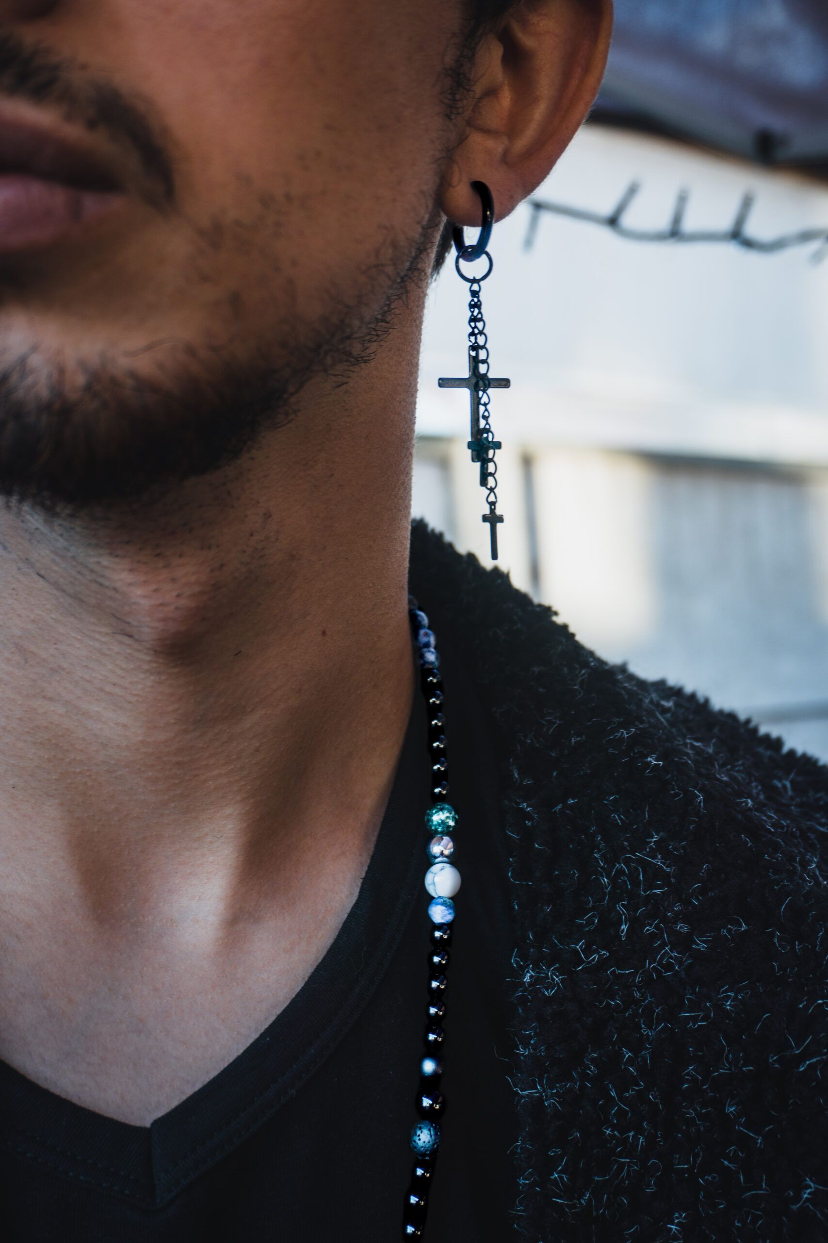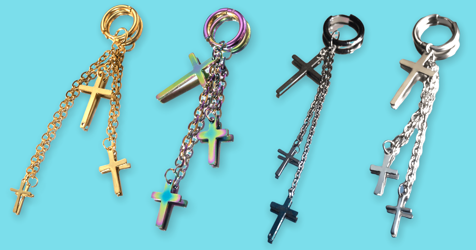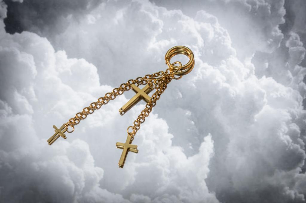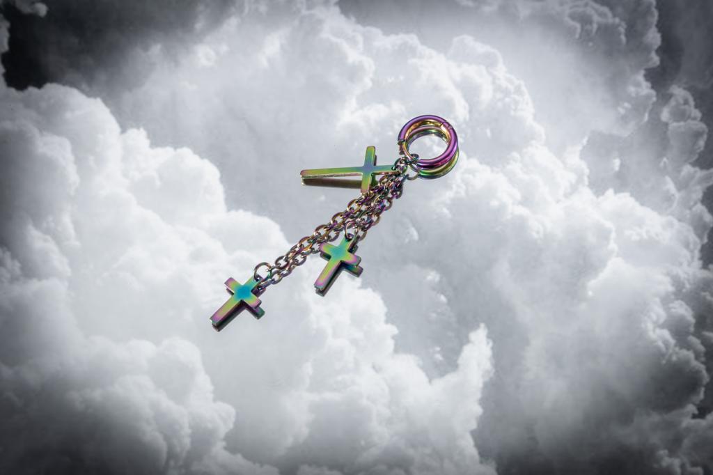 El diseñopresenta tres cruces delicadamente colgando de cadenas unidas a una argolla tipo clip de acero inoxidable. Disponible en una variedad de colores vibrantes, esta pieza única combina elegancia y simbolismo en cada detalle.