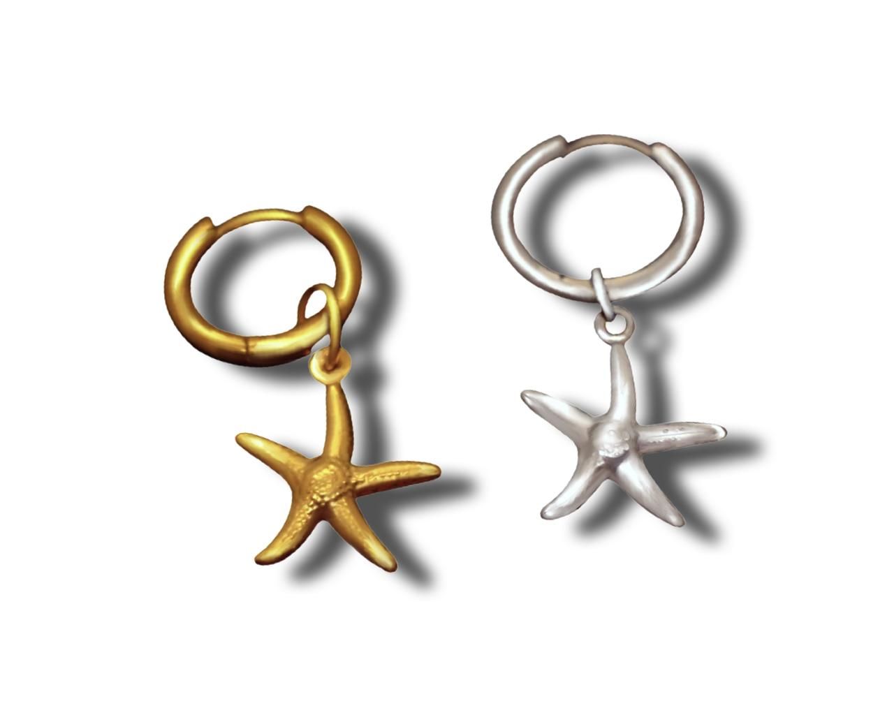Sumérgete en la elegancia marina con nuestro aro colgante de estrella de mar tallado, disponible en acero inoxidable en dorado y plateado. Este encantador accesorio captura la belleza natural y la delicadeza de la estrella de mar, transformándola en una pieza de joyería que evoca la serenidad del océano.