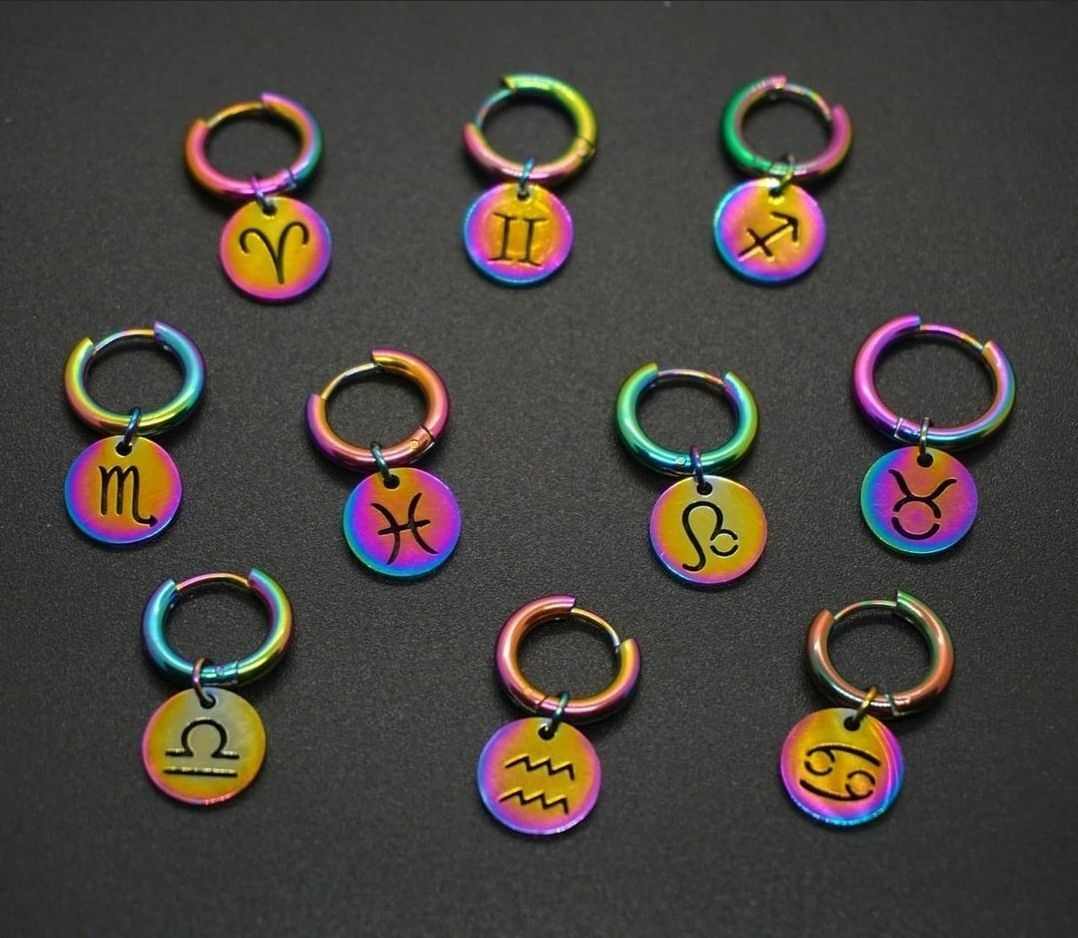 Ya sea que los uses para complementar tu look diario o como un regalo significativo para alguien especial, nuestros aros colgantes de acero inoxidable de cada signo zodiacal en plateado y tornasol son la elección perfecta para aquellos que valoran la astrología y la belleza en cada detalle.