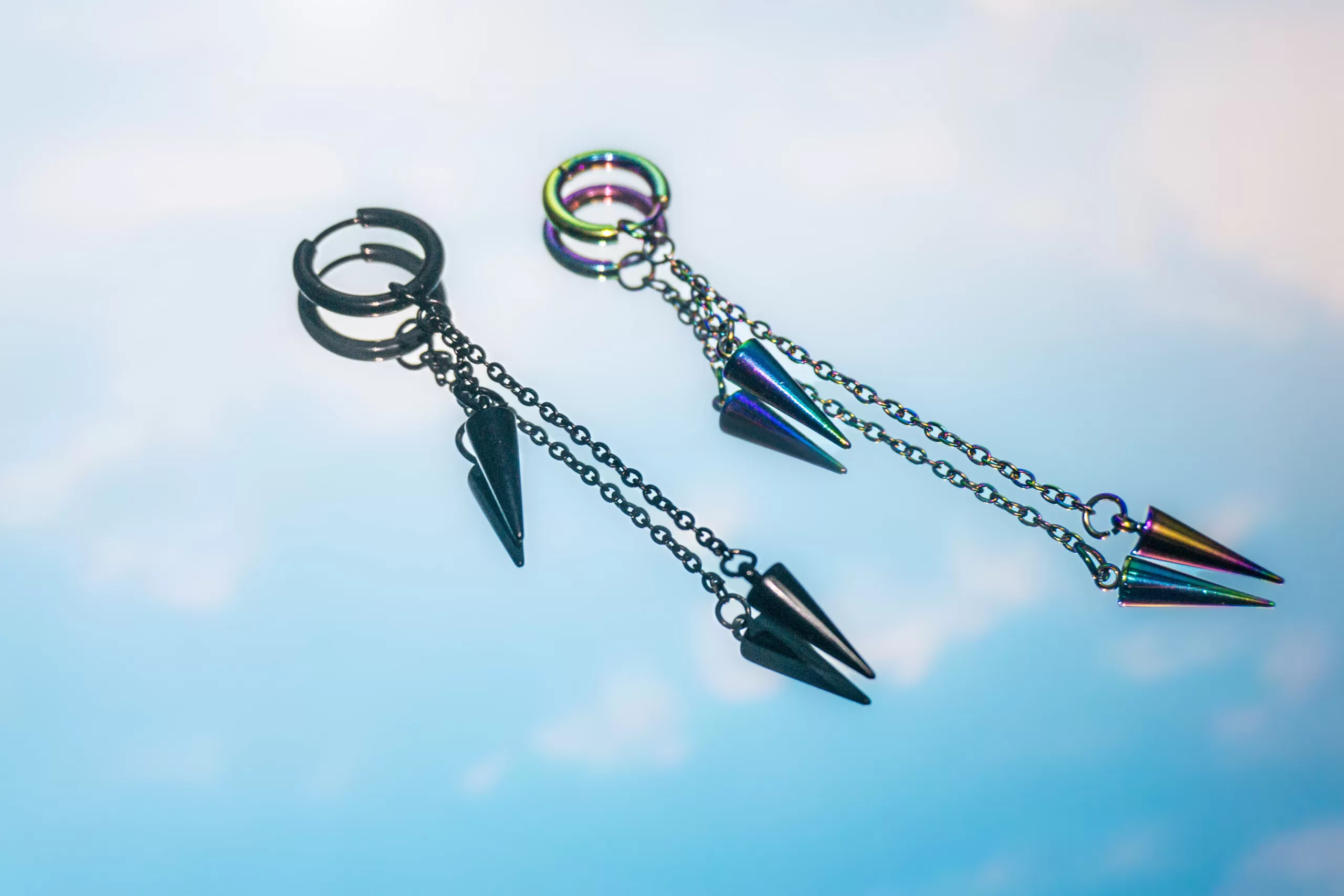 En los colgantes con cadena doble péndulo encontraras dos péndulos colgando de una cadena en posiciones distintas (más alto y más abajo, cada uno en una extremidad de la cadena, estos agarrados por una argolla tipo clip, todo del mismo color.
