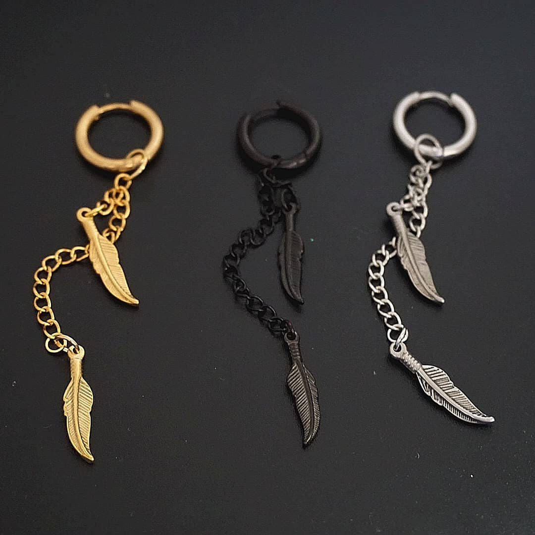 En los colgantes con cadena doble pluma encontraras dos plumas colgando de una cadena en posiciones distintas (más alto y más abajo, cada uno en una extremidad de la cadena, estos agarrados por una argolla tipo clip, todo del mismo color.
