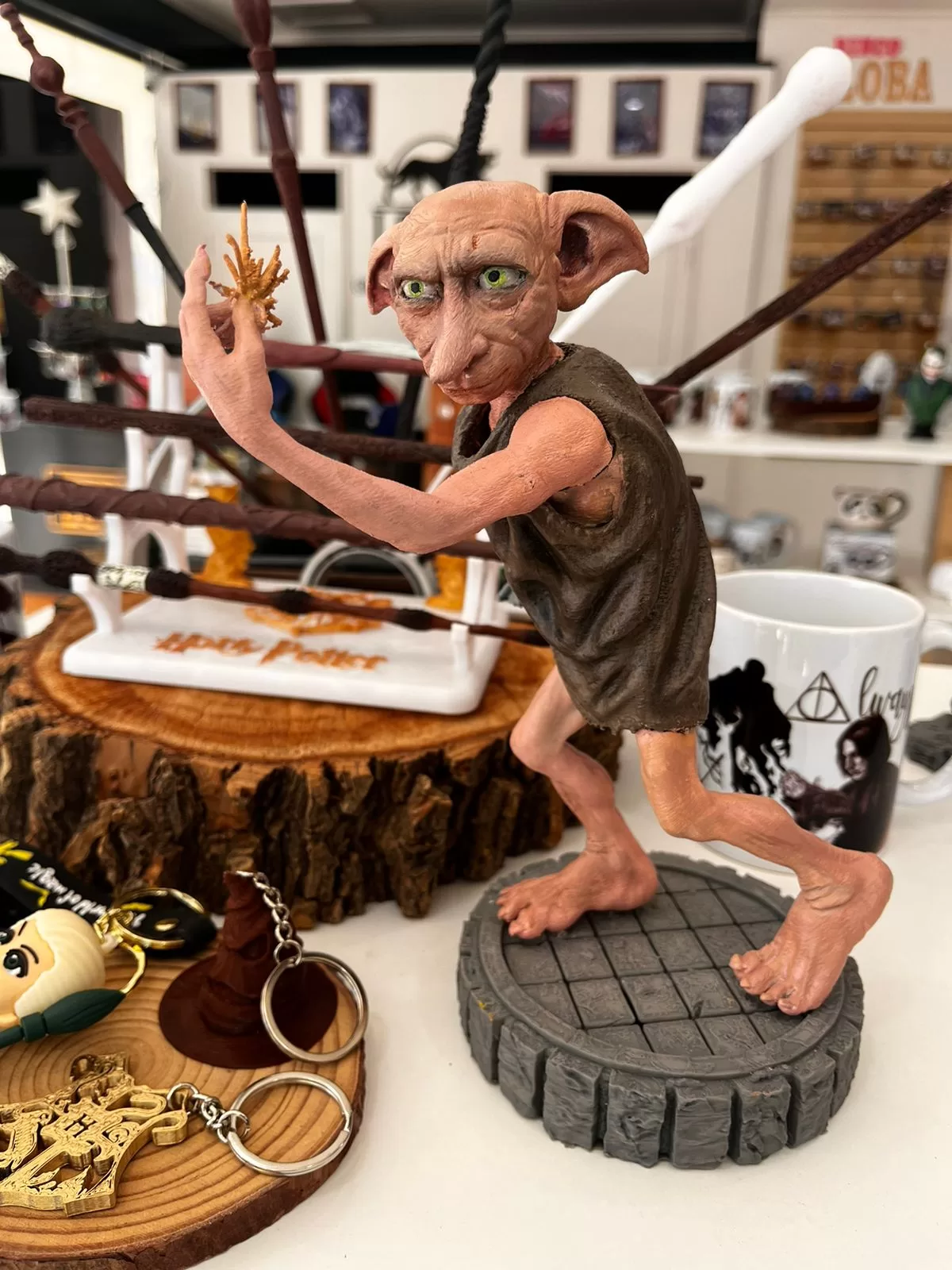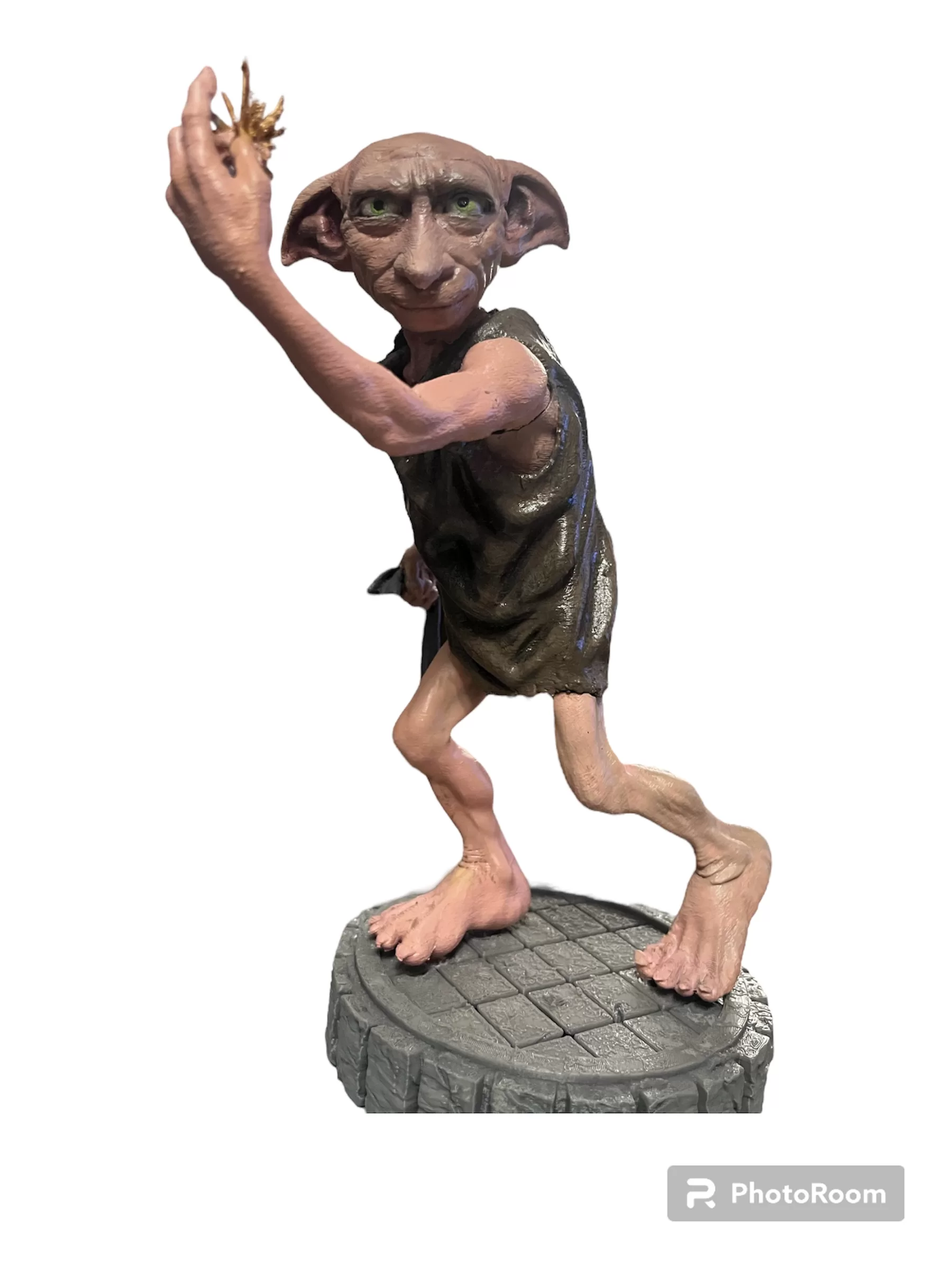 Figura esculpida en 3D del personaje dobby de harry potter, mide 23 centímetros de alto.