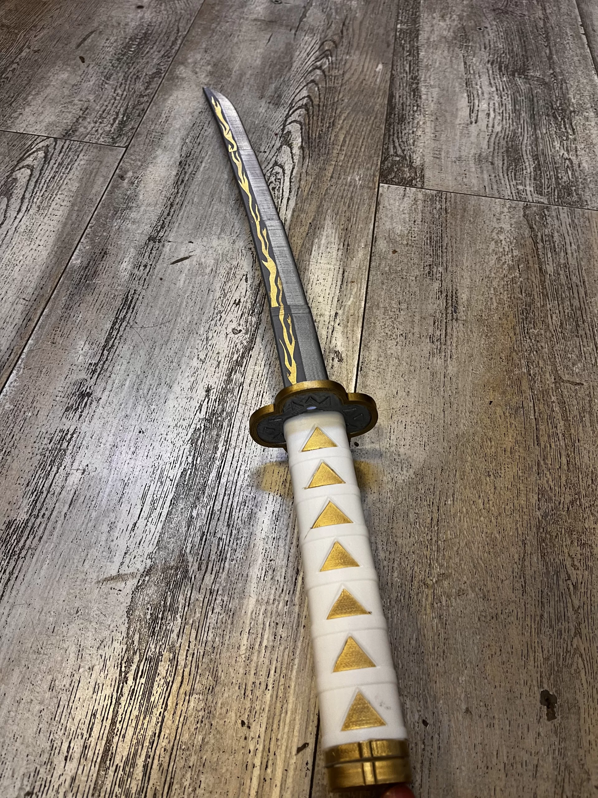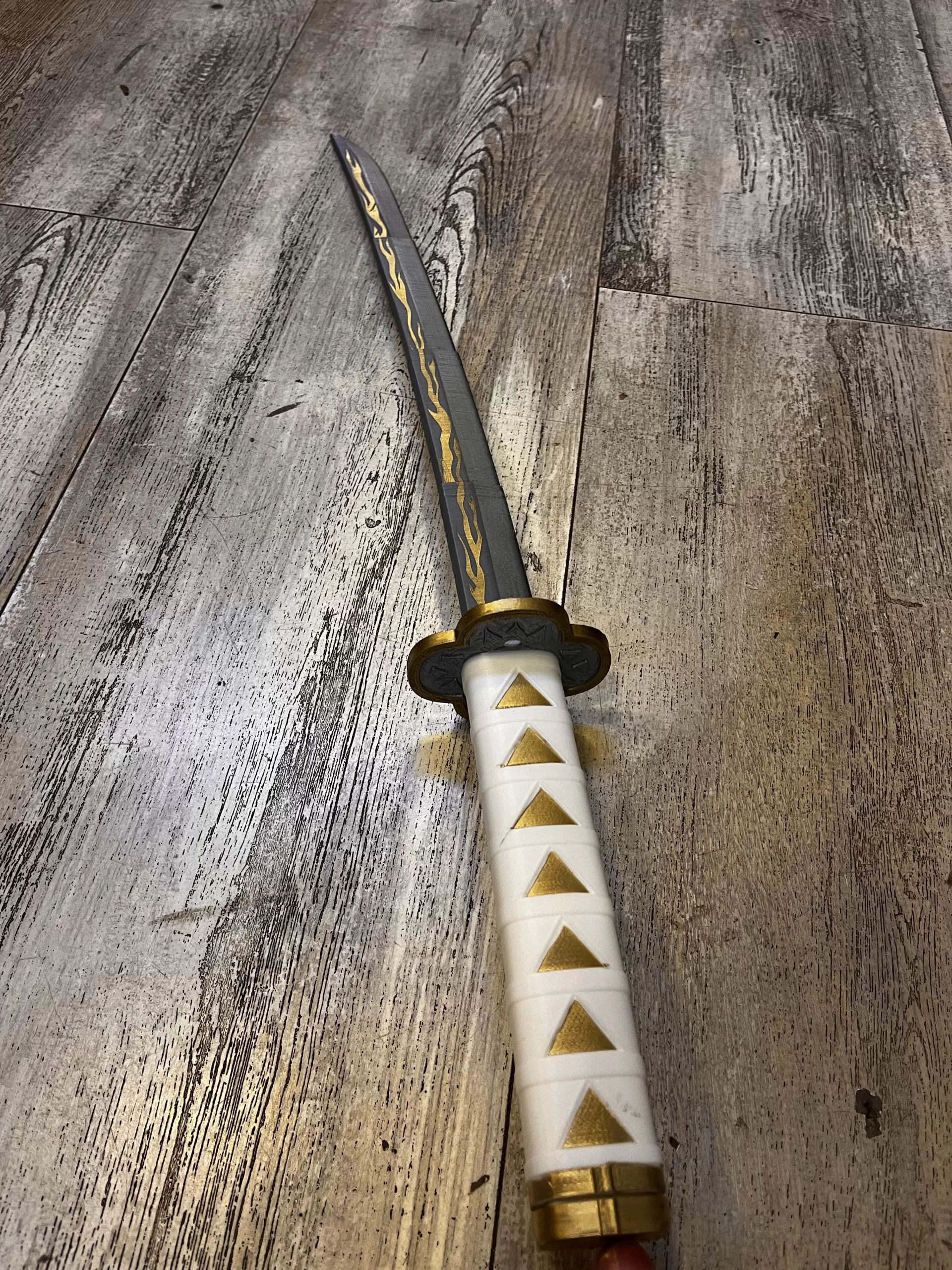 Fabricada en impresión 3D con acabados de alta calidad, esta espada ofrece tanto una apariencia impresionante como una funcionalidad auténtica al utilizarla, siendo muy segura al retraerse al chocar con algo. Su hoja retráctil y detalles meticulosos hacen honor al anime y manga original, siendo un elemento imprescindible para cualquier fanático de «Demon Slayer».