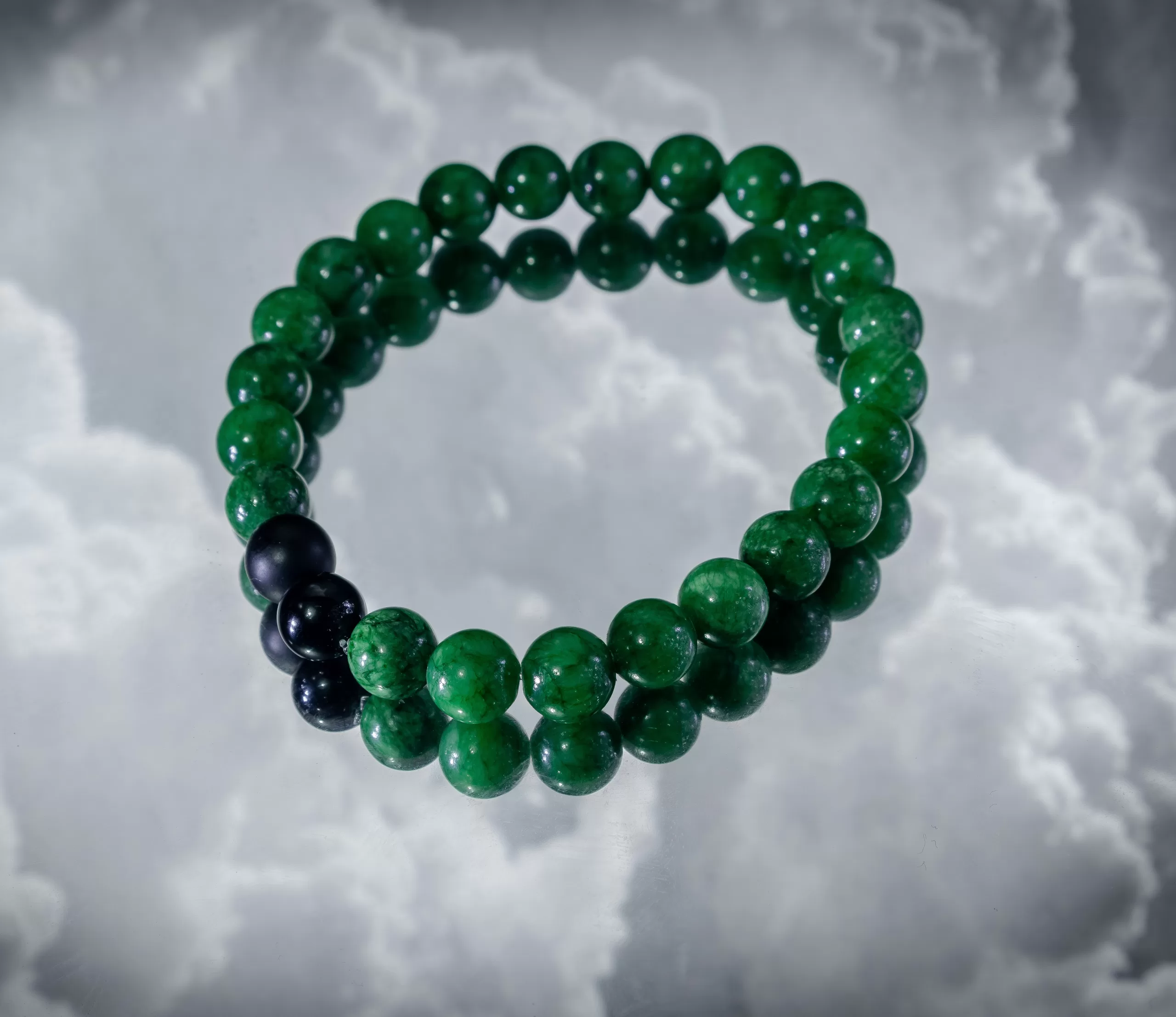 En nuestra tienda confeccionamos una serie de pulseras de distintos tipos y lineas, esta es de la linea elástica, la Pulsera de piedras green eclipsed está meticulosamente confeccionada con piedras naturales verdes, complementada por dos piedras negras, onix y volcánica. Esta pulsera no solo es una declaración de moda, sino también una conexión con la naturaleza. Podrás usar el diseño a diario sin temor al deterioro de las piedras o el dije ya que son piedras reales naturales.